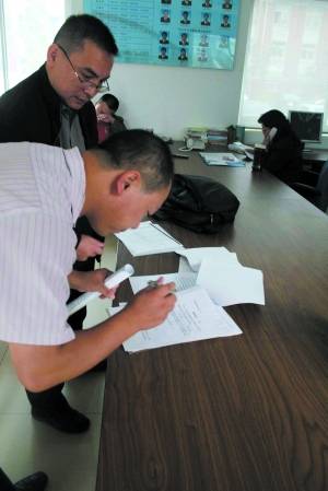 方玄昌在申请书上签字。晨报记者 郝涛/摄