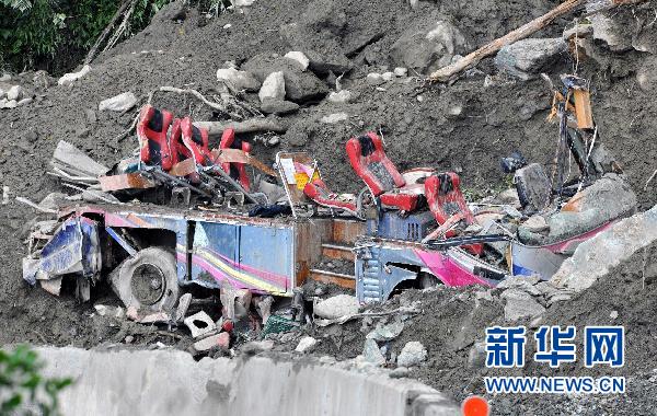 搭载湖北、贵州等地游客的旅行车被掩埋在苏花公路114.5公里处,事发时车上人员已砸窗逃生(10月26日摄)。新华社记者 何俊昌 摄