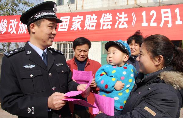 11月30日,山东枣庄市公安局市中分局民警在广济路向市民宣传新修改的《中华人民共和国国家赔偿法》。新修改的《中华人民共和国国家赔偿法》12月1日起正式实施。2010年4月29日,十一届全国人大常委会第十四次会议通过了共27条的关于修改国家赔偿法的决定。 新华社发(孙中喆 摄)