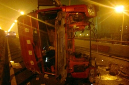 杭州钱江三桥辅桥部分桥面塌落。图为正在起吊失事货车。来源:网友“小徐胖子附体”