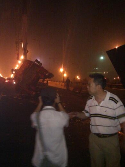 杭州钱江三桥辅桥部分桥面塌落。图为事故现场。来源:网友“小徐胖子附体”