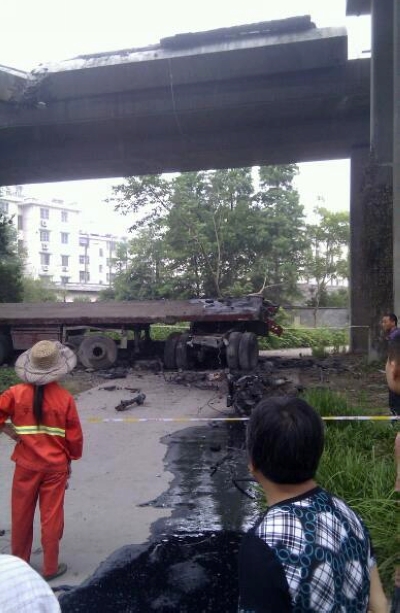 7月15日凌晨,杭州钱江三桥辅桥主桥面右侧车道部分桥面突然塌落,一辆重型半挂车从桥面坠落,又将下闸道砸塌。司机跳车受伤,送往医院救治。新华社记者鞠焕宗摄