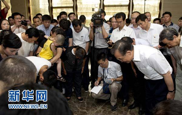 温家宝在金球国豪酒店看望部分死伤人员家属,向家属深深鞠躬,表示深切慰问。新华社记者 黄敬文 摄
