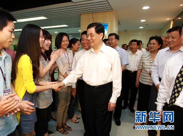 8月11日至15日,中共中央总书记、国家主席、中央军委主席胡锦涛在广东省考察工作。这是胡锦涛在考察深圳华强文化科技集团股份有限公司时,勉励企业为推动社会主义文化大发展大繁荣作贡献。新华社发