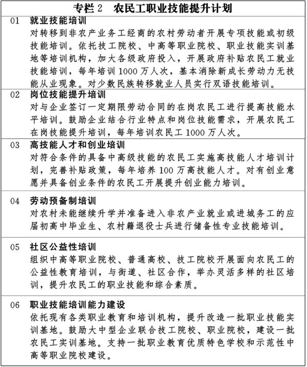 加强农民工职业技能培训,提高就业创业能力和职业素质。整合职业教育和培训资源,全面提供政府补贴职业技能培训服务。强化企业开展农民工岗位技能培训责任,足额提取并合理使用职工教育培训经费。鼓励高等学校、各类职业院校和培训机构积极开展职业教育和技能培训,推进职业技能实训基地建设。鼓励农民工取得职业资格证书和专项职业能力证书,并按规定给予职业技能鉴定补贴。加大农民工创业政策扶持力度,健全农民工劳动权益保护机制。实现就业信息全国联网,为农民工提供免费的就业信息和政策咨询。
