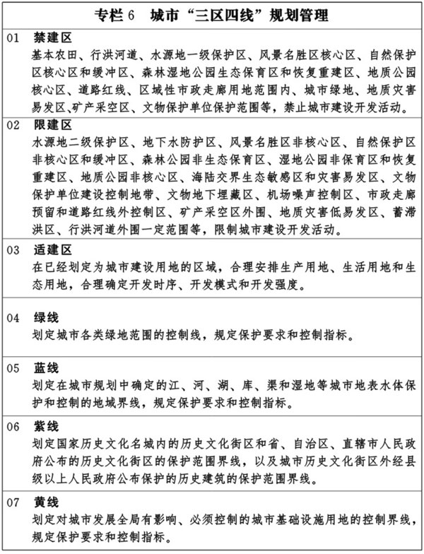 把以人为本、尊重自然、传承历史、绿色低碳理念融入城市规划全过程。城市规划要由扩张性规划逐步转向限定城市边界、优化空间结构的规划,科学确立城市功能定位和形态,加强城市空间开发利用管制,合理划定城市“三区四线”,合理确定城市规模、开发边界、开发强度和保护性空间,加强道路红线和建筑红线对建设项目的定位控制。统筹规划城市空间功能布局,促进城市用地功能适度混合。合理设定不同功能区土地开发利用的容积率、绿化率、地面渗透率等规范性要求。建立健全城市地下空间开发利用协调机制。统筹规划市区、城郊和周边乡村发展。