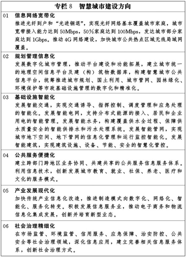统筹城市发展的物质资源、信息资源和智力资源利用,推动物联网、云计算、大数据等新一代信息技术创新应用,实现与城市经济社会发展深度融合。强化信息网络、数据中心等信息基础设施建设。促进跨部门、跨行业、跨地区的政务信息共享和业务协同,强化信息资源社会化开发利用,推广智慧化信息应用和新型信息服务,促进城市规划管理信息化、基础设施智能化、公共服务便捷化、产业发展现代化、社会治理精细化。增强城市要害信息系统和关键信息资源的安全保障能力。
