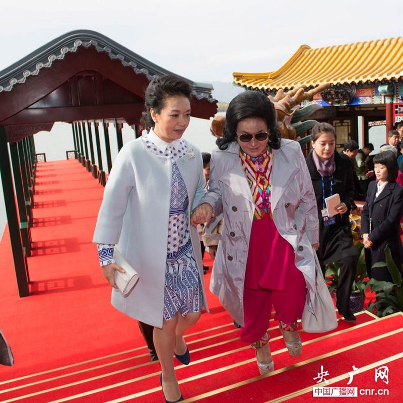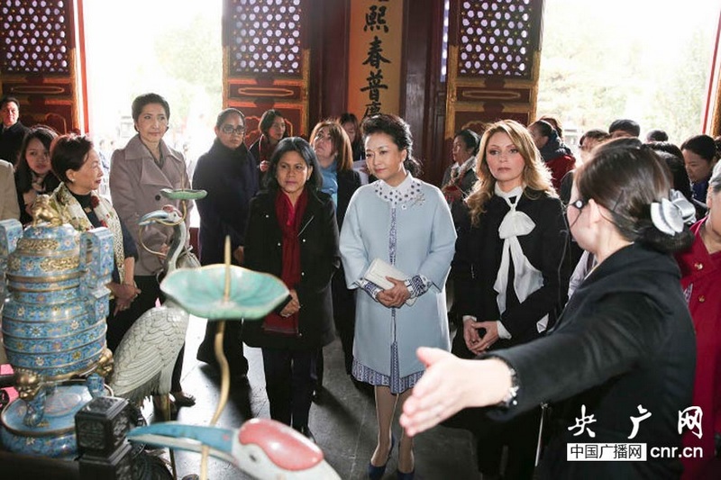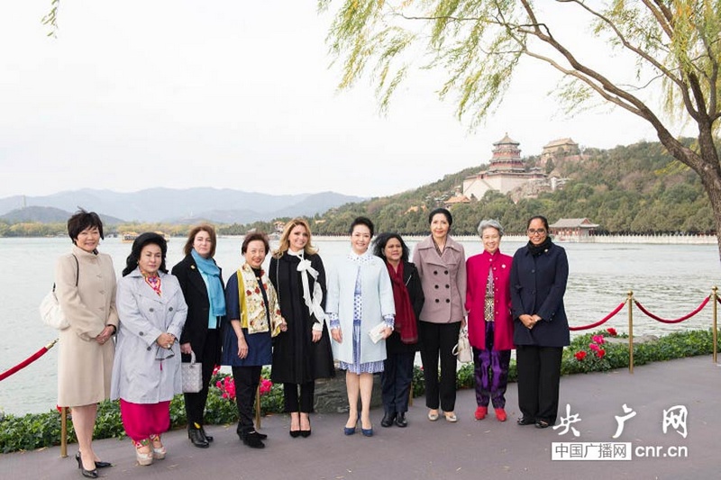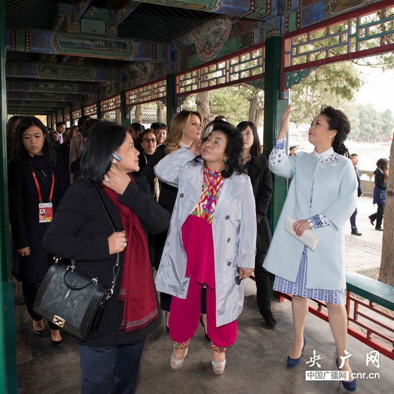 中央台消息:国家主席习近平夫人彭丽媛11日邀请来华出席2014年亚太经合组织领导人非正式会议的部分经济体领导人或代表的夫人参观世界文化遗产颐和园。