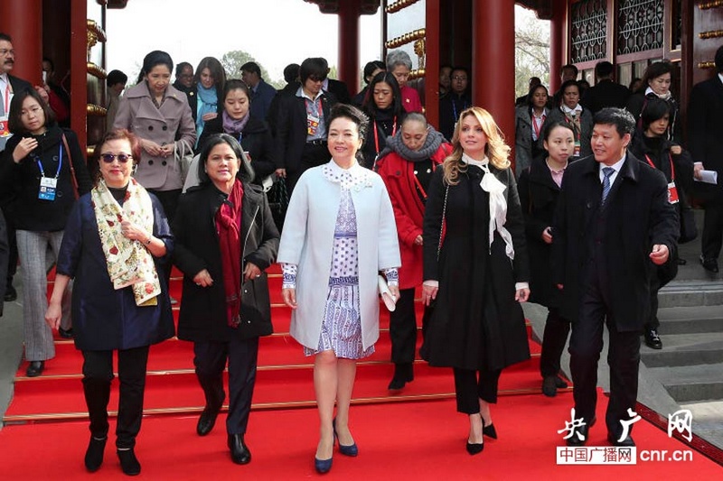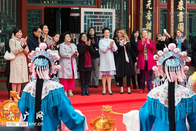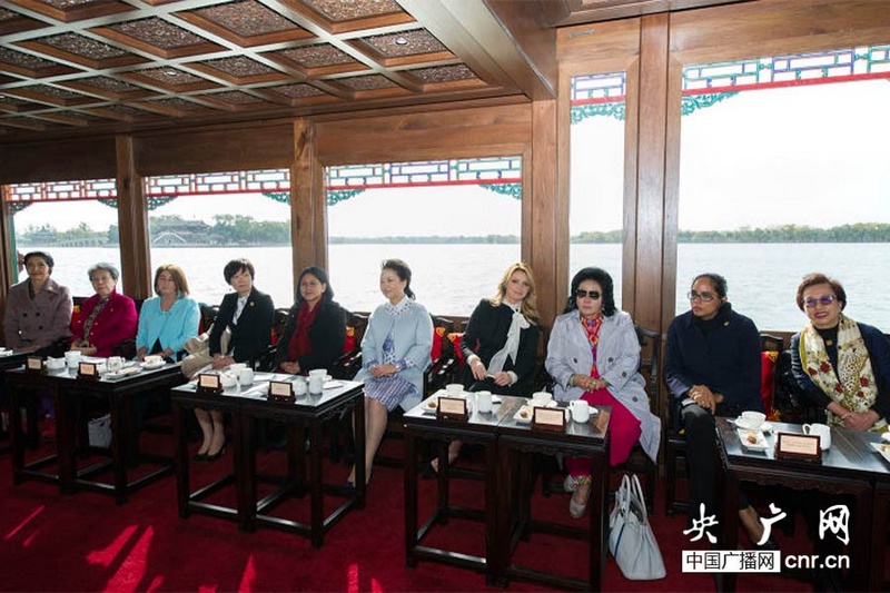 上午,印度尼西亚总统夫人伊莉娅娜、墨西哥总统夫人里韦拉、日本首相夫人安倍昭惠、马来西亚总理夫人罗斯玛赫、新西兰总理夫人布罗娜、巴布亚新几内亚总理夫人琳达、新加坡总理夫人何晶、泰国总理夫人娜拉蓬、台湾两岸共同市场基金会荣誉董事长夫人朱俶贤陆续抵达颐和园。彭丽媛同她们一一握手,表示热烈欢迎。