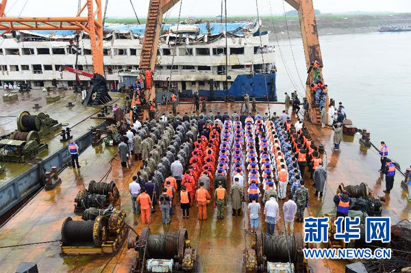 6月7日,在场人员脱帽默哀。当日,在湖北监利,“东方之星”号客轮翻沉事件救援现场举行哀悼遇难者活动,现场所有人员肃立默哀3分钟,船舶同时鸣笛3分钟。新华社记者郝同前摄