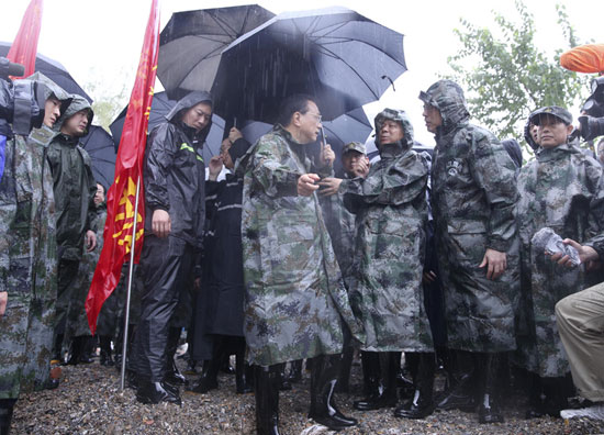 此前一天,李克强刚刚从安徽、湖南汛区急赴湖北武汉,冒着大雨赶往青山区长江干堤倒口湖堤段管涌抢险现场察看。
