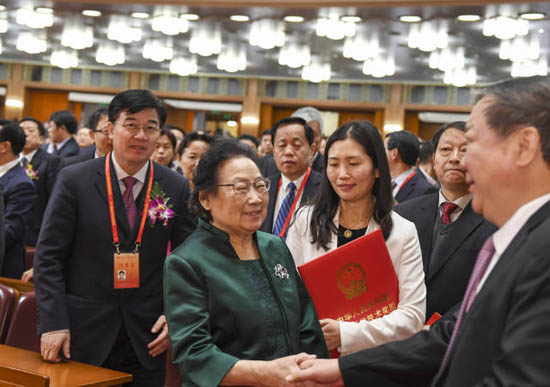 1月9日,中共中央、国务院在北京隆重举行国家科学技术奖励大会。这是大家向获得2016年度国家最高科学技术奖的中国中医科学院屠呦呦研究员表示祝贺。新华社记者 李学仁 摄