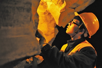 贵州贵阳工务段乌江桥路检查工区工人在检查溶洞岩石发育情况。 |