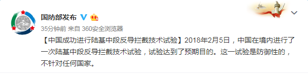 我国成功进行陆基中段反导拦截技术试验