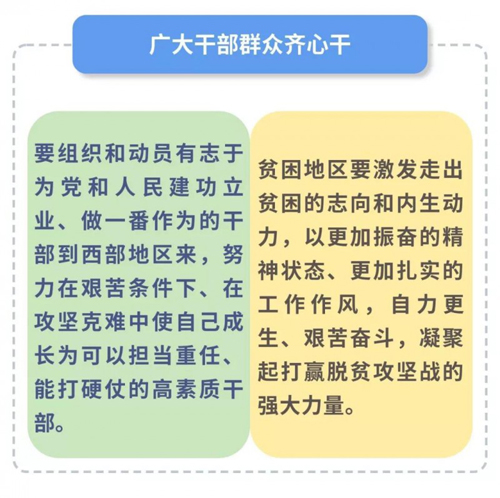 脱贫攻坚进入倒计时。行百里者半九十。从现在到2020年,是全面建成小康社会决胜期,最艰巨的任务依然是脱贫攻坚。习近平强调:“‘人心齐,泰山移。’脱贫致富不仅仅是贫困地区的事,也是全社会的事。要更加广泛、更加有效地动员和凝聚各方面力量。要强化东西部扶贫协作。”