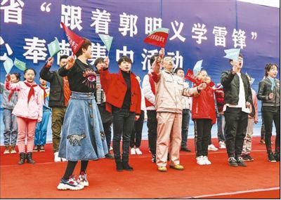 在葫芦岛市文化广场举行的辽宁省“跟着郭明义学雷锋”爱心奉献集中活动现场,郭明义(前排中)与志愿者合唱《学习雷锋好榜样》。 新华社记者 潘昱龙摄