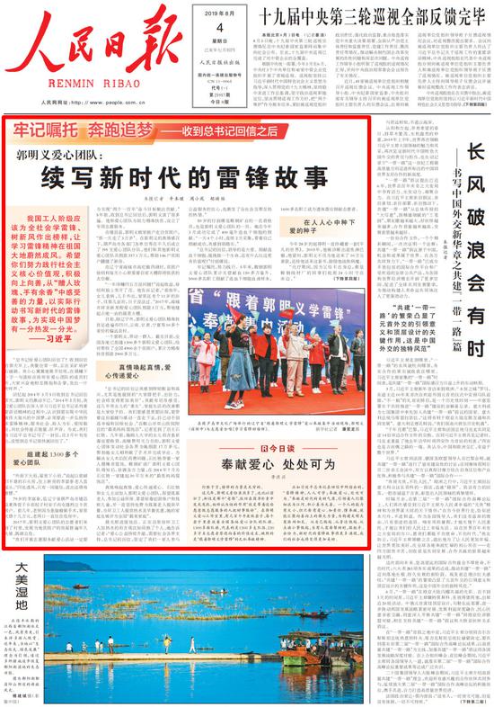 人民日报推出“牢记嘱托 奔跑追梦——收到总书记回信之后”系列报道,与您一起见证发展变化、感悟初心使命。今天(8月4日)刊发第三篇《郭明义爱心团队:续写新时代的雷锋故事》。