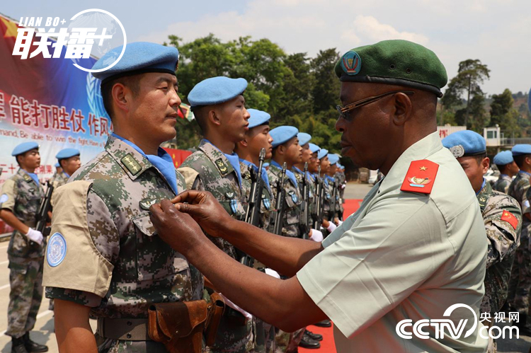 2019年8月8日,在刚果(金)布卡武市“中国半岛”营区,嘉宾代表为中国第22批赴刚果(金)维和部队官兵授勋。