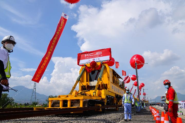 万隆分会场,伴着一声清脆鸣笛,一辆崭新亮丽的综合检测车亮起车头大灯,缓缓驶出德卡鲁尔车站并逐渐加速前行。全场响起热烈掌声。