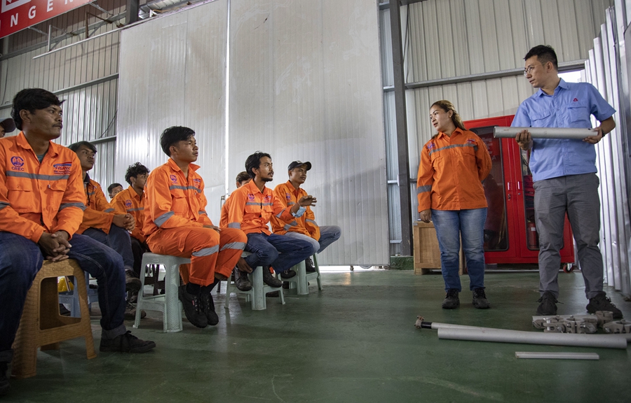 11月13日,在印度尼西亚万隆,来自中国中铁电气化局的王浩(右一)向印尼员工讲解中国标准“简统化”接触网装配工艺。新华社发 (焦宏涛 摄)