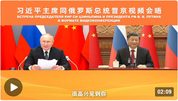 习近平说:“尊敬的普京总统,我的老朋友,很高兴同你再次会晤。在岁末之际举行视频会晤,已经成为我们的一个好传统。在我们的共同引领下,中俄新时代全面战略协作伙伴关系更加成熟、坚韧。面对变乱交织的国际形势,中方愿同俄方加强战略协作,坚持互为发展机遇、互为全球伙伴,努力为两国人民创造更多福祉,为世界注入更多稳定性。我也愿同总统先生就双边关系及共同关心的重大问题,交换意见,而且经常及时交换意见。”