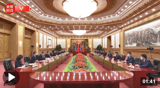 奥云额尔登说:“习近平主席,很高兴再次同您会面。疫情期间,在您的领导下,中国成功举办2022年北京冬奥会,这为全球抗击疫情注入了强烈的信心。蒙古谚语说:患难见真情。疫情期间,中国将自己的疫苗和物资援助给我们,蒙古国人民不会忘记。”