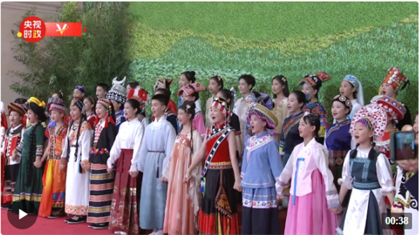 50名身着当地少数民族服饰的少年儿童唱起四川民歌《太阳出来喜洋洋》,热情欢迎各国贵宾。