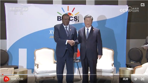 当地时间8月24日上午,国家主席习近平在约翰内斯堡出席金砖国家领导人会晤期间会见纳米比亚总统根哥布。