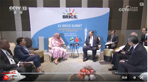 当地时间8月24日上午,国家主席习近平在约翰内斯堡出席金砖国家领导人会晤期间会见坦桑尼亚总统哈桑。