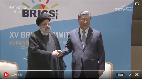 当地时间8月24日上午,国家主席习近平在约翰内斯堡出席金砖国家领导人会晤期间会见伊朗总统莱希。