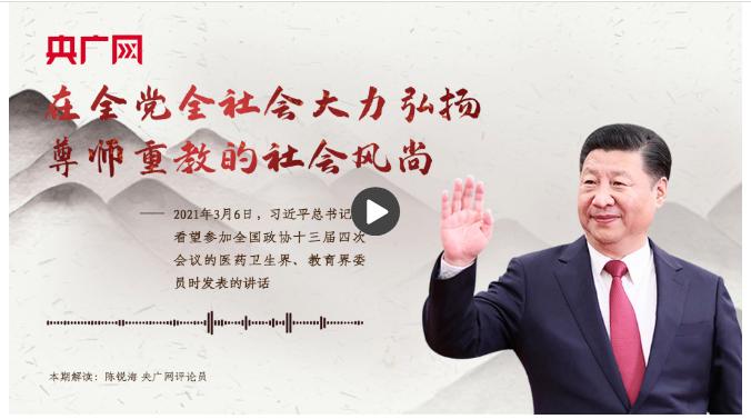 习近平:要在全党全社会大力弘扬尊师重教的社会风尚,推动形成优秀人才竞相从教、广大教师尽展其才、好老师不断涌现的良好局面。