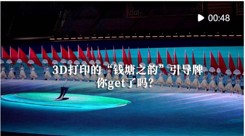 引导员高举的“钱塘之韵”引导牌别具一格。导演团队选择使用3D打印技术制作的这个引导牌,以古典方纹样结合工笔牡丹纹为形象基础,创新应用3D打印技术设计镂空扇面,形如钱塘江浪潮,写意化展现中国传统文化底蕴和钱塘江潮的独特魅力。