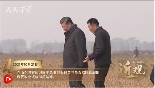 2021年10月21日上午,习近平总书记来到山东东营,踏上这片广袤的盐碱地。