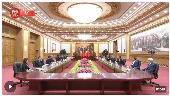 10月17日上午,国家主席习近平在人民大会堂同来华出席第三届“一带一路”国际合作高峰论坛并进行国事访问的智利总统博里奇举行会谈。