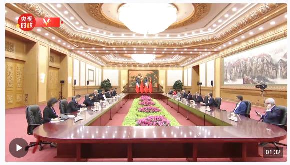 10月17日上午,国家主席习近平在人民大会堂同来华出席第三届“一带一路”国际合作高峰论坛并进行国事访问的智利总统博里奇举行会谈。