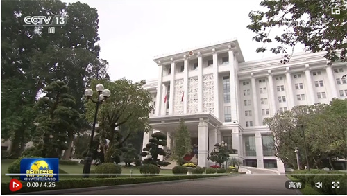 习近平车队驶入政府驻地时,数百名越南青年和各界代表手持两国国旗,夹道热烈欢迎。