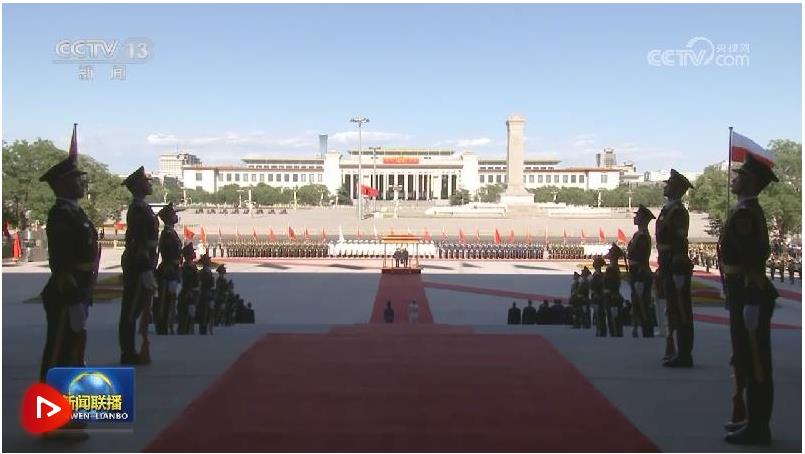 杜达抵达时,礼兵列队致敬。两国元首登上检阅台,军乐团奏中波两国国歌,天安门广场鸣放21响礼炮。杜达在习近平陪同下检阅中国人民解放军仪仗队,并观看分列式。