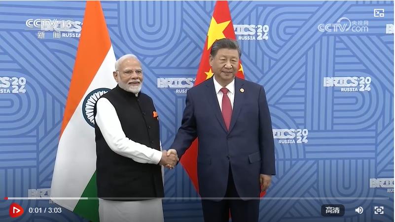当地时间10月23日,国家主席习近平在喀山出席金砖国家领导人会晤期间会见印度总理莫迪。