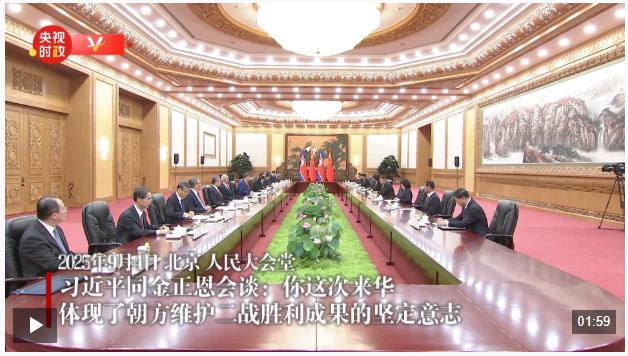 9月4日晚,中共中央总书记、国家主席习近平在北京人民大会堂同来华出席纪念中国人民抗日战争暨世界反法西斯战争胜利80周年活动的朝鲜劳动党总书记、国务委员长金正恩举行会谈。