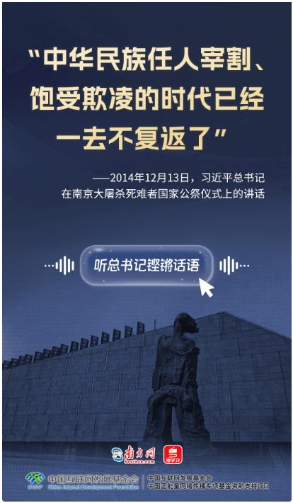 11年前的这一天,在首次南京大屠杀死难者国家公祭仪式上,习近平总书记强调:我们为南京大屠杀死难者举行公祭仪式,是要唤起每一个善良的人们对和平的向往和坚守,而不是要延续仇恨。