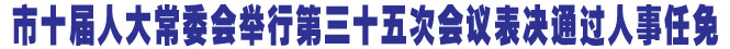 本报讯(记者杜玲)昨日上午,市十届人大常委会举行第三十五次会议,表决通过了有关人事任免事项。市人大常委会主任郭国明主持会议,市人大常委会副主任张建设、白富海、宫素清、苗绍勇、孔相如、张动天及秘书长郑慎轩出席会议。常务副市长赵海燕列席会议。