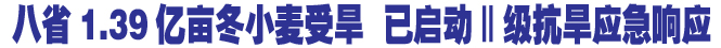 本报北京2月4日电 (记者赵永平)国家防总最新统计,截至2月4日,河北、山西、安徽、江苏、河南、山东、陕西、甘肃等8省冬麦区受旱面积总计达1.39亿亩,约占上述8省冬小麦播种面积的46%,其中重旱4389万亩。全国作物受旱面积1.46亿亩,其中作物干枯98万亩,有398万人、195万头大牲畜因旱发生饮水困难。为了应对这次历史罕见的严重干旱,国家防总于4日启动Ⅱ级抗旱应急响应,并派出6个工作组,赴旱区指导抗旱。近日,国家防总商财政部再次安排特大抗旱补助费支持旱区抗旱工作。