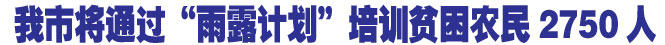 本报讯(记者杜玲 通讯员桑亚军)记者近日从市财政局获悉,今年,我市将通过“雨露计划”培训贫困农民2750人,其中职业技能培训1250人,包括企业直接培训安置就业200人、3个月技能培训550人、2年职业教育“蓝领班”培训500人;引导性培训1500人,进一步提高贫困地区农民的整体素质,增强其劳务就业和创业能力。