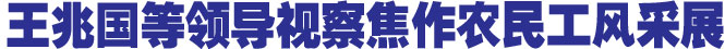 本报北京3月2日电(特派记者董柏生)今日上午,河南省农民工风采展在全国农业展览馆隆重开幕,出席开幕式的中共中央政治局委员、全国人大常委会副委员长、中华全国总工会主席王兆国,全国政协副主席郑万通以及省领导徐光春、郭庚茂、陈全国、王全书,视察了焦作农民工风采展,市委书记路国贤向莅临展览的党和国家领导人以及省领导汇报了我市的农民工工作情况。