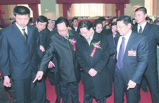 3月2日上午,中共中央政治局委员、全国人大常委会副委员长、中华全国总工会主席王兆国(前左三)在省委书记、省人大常委会主任徐光春(前左二),市委书记路国贤(前左四)等的陪同下到焦作展厅视察。