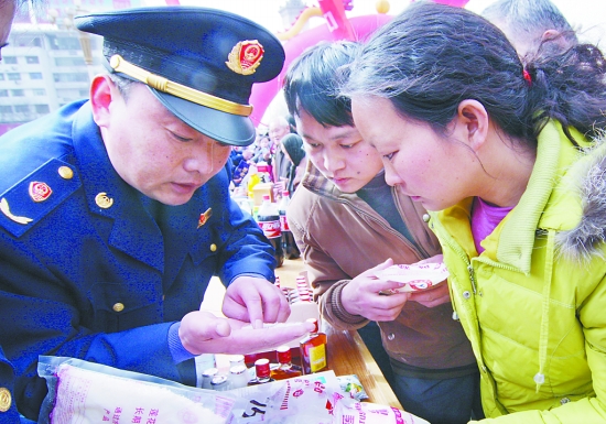 3月15日这天,各县市区工商部门将查获的假冒伪劣产品运到了现场,真假对照,教市民识别。
