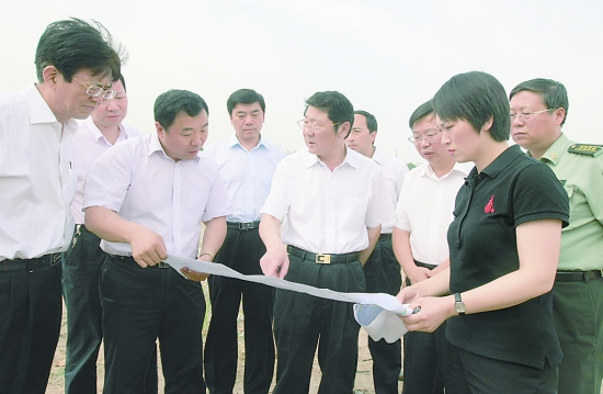 昨日下午,市领导路国贤、王明德、阚辉、贾书君在南水北调中线工程焦作城区段山阳区定和工程用地动迁现场检查工作。 本报记者 赵耀东 摄 |