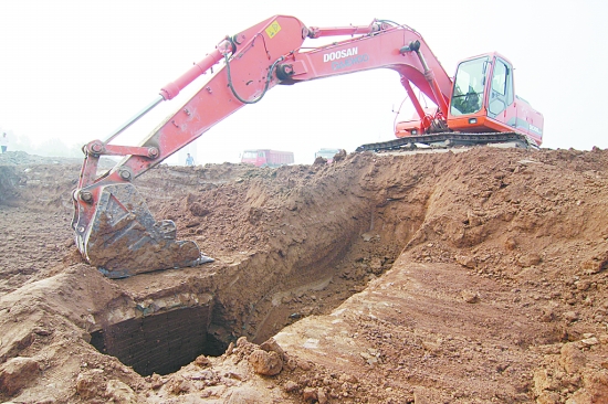 7月27日,一市民向记者报料:南水北调焦作段苏蔺村境内发现一座古墓葬。记者遂即向市文物工作队反馈了这一情况。市文物工作队立即派出工作人员进入施工现场,对古墓葬展开先期保护。昨日一早,记者在发掘现场看到,文物工作人员指挥一辆铲车铲去古墓券顶后,又指挥工人用铁钎铲去浮土,古墓葬的墓室已完全露出。市文物工作队考古部主任刘勇称:“为了不影响南水北调工程的施工进度,我们对古墓葬进行了抢救性发掘,在对其进行大开挖后,我们会派专业人员进入墓室发掘文物。”