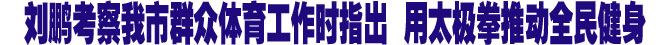 昨日一早,我市众多的市民便和往常一样,来到龙源湖公园练习太极拳、跳健身操、打羽毛球,从事自己喜爱的体育运动。看到我市群众自发健身的热情如此高涨,了解到自2007年起,我市在全省率先开始实施全民体育健身工程,并将此项工作连续3年列入市委、市政府向市民承诺的十件实事,目前全市1985个行政村和社区共建成全民体育健身工程1200个,完成率位居全省第一,并且力争到2010年年底,完成全市所有行政村和社区的全民体育健身工程建设任务,让全市人民在家门口就能参加篮球、乒乓球、门球等健身活动,让体育真正惠及群众时,刘鹏非常高兴。他说,一个拥有300多万人口的城市,参与太极拳训练健身的就超过100万人,这样多的参与人数、这样大的比例非常不简单,就凭这一点,说明焦作的群众体育工作做得非常好。焦作是太极之乡,焦作的太极拳交流大赛已经举办了五届,已经形成了一个品牌。希望焦作不仅把太极拳交流大赛看成自己的名片,更要使其成为推动全民健身的助推剂。