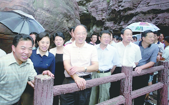 8月21日,国家体育总局局长刘鹏(前左三)在省委常委、宣传部长、副省长孔玉芳,省体育局党组书记彭德胜和市领导路国贤、王长松等的陪同下在云台山调研。
